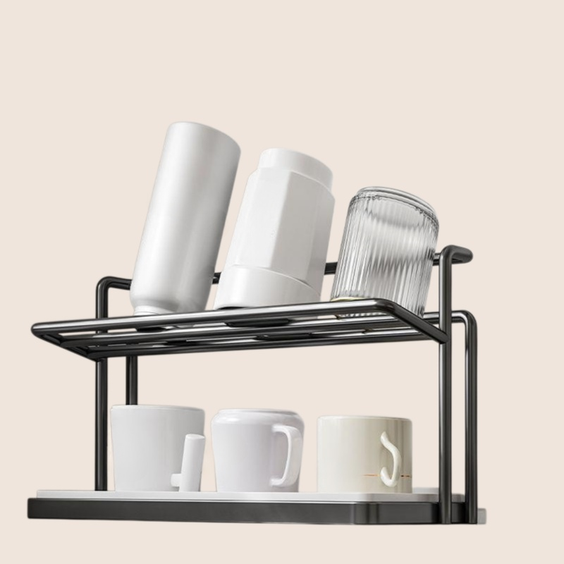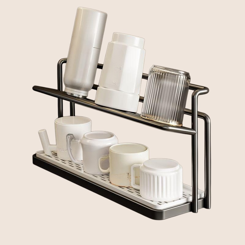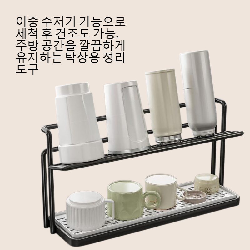 주방 공간 효율적인 활용, 테이블 위 정리, 다양한 크기 물컵 정리 가능, 튼튼한 구조, 간편한 설치, 청소 용이, 내구성 우수.